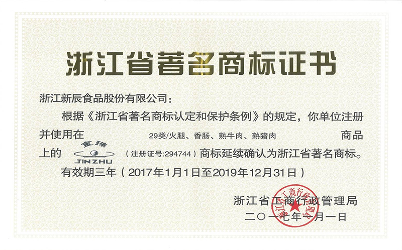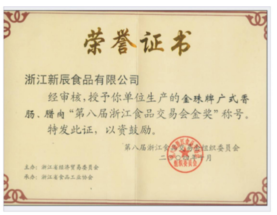 金珠牌廣式香腸、臘肉“第八屆浙江食品交易會金獎”稱號