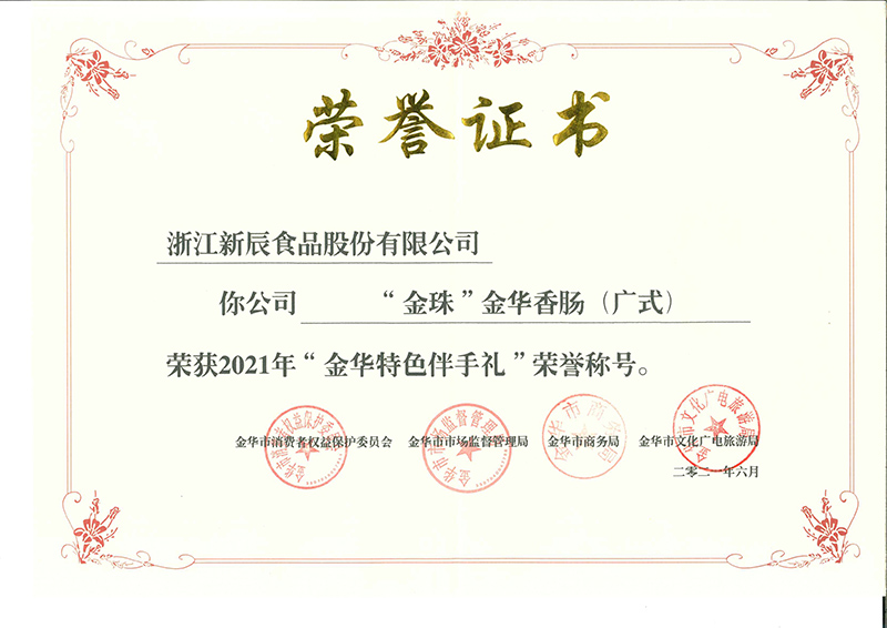 金珠”金華香腸(廣式)榮獲2021年“金華特色伴手禮”榮譽稱號。